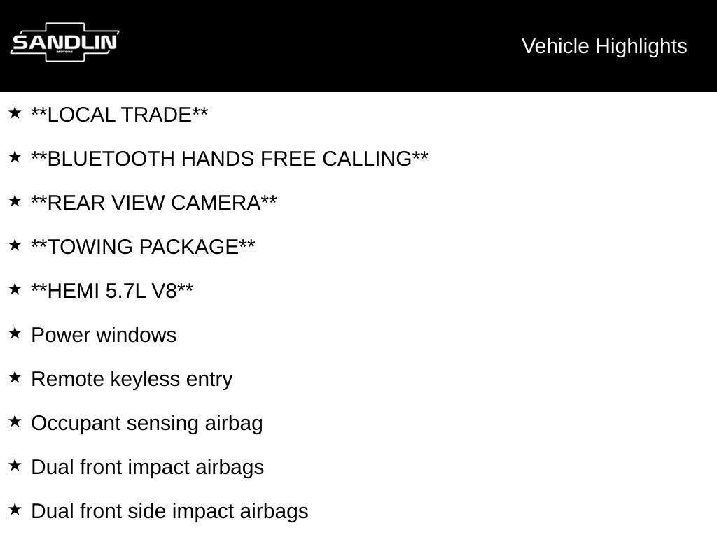 **LOCAL TRADE**, **Bluetooth® HANDS FREE CALLING**, **REAR VIEW CAMERA**, **TOWING PACKAGE**, **HEMI 5.7L V8**, 3.21 Rear Axle Ratio, Charge Only Remote USB Port, Delay-off headlights, Dual front impact airbags, Dual front side impact airbags, Fully automatic headlights, Occupant sensing airbag, Overhead airbag, Power door mirrors, Power windows, Remote keyless entry, Speed control, Tilt steering wheel.