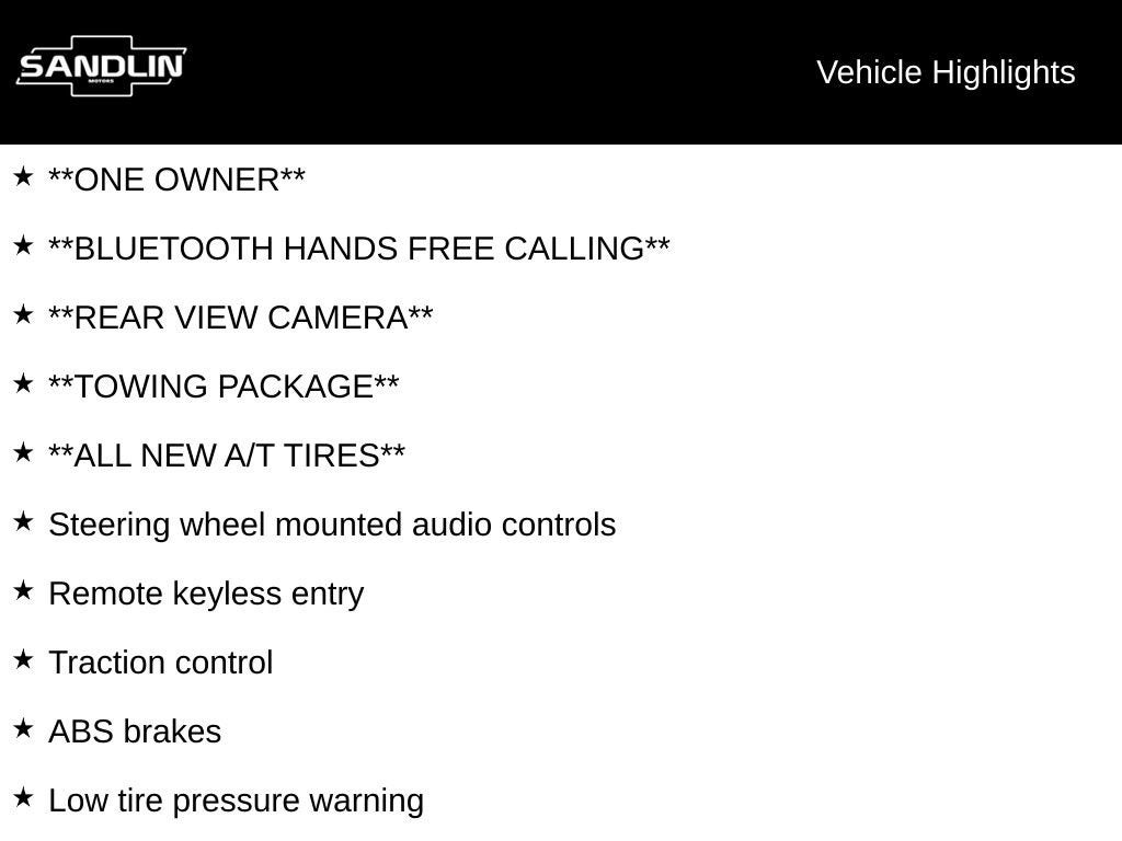 **ONE OWNER**, **Bluetooth® HANDS FREE CALLING**, **REAR VIEW CAMERA**, **TOWING PACKAGE**, **ALL NEW A/T TIRES**, 4WD, ABS brakes, Alloy wheels, Auto High-beam Headlights, Compass, Delay-off headlights, Electronic Stability Control, Front fog lights, Fully automatic headlights, Heated door mirrors, Illuminated entry, Low tire pressure warning, Power door mirrors, Remote keyless entry, Speed control, Steering wheel mounted audio controls, Telescoping steering wheel, Tilt steering wheel, Traction control.