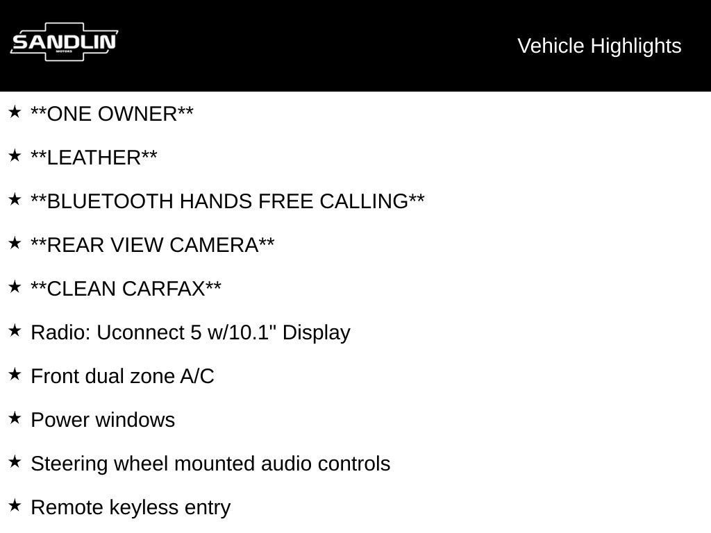 **ONE OWNER**, **LEATHER**, **Bluetooth® HANDS FREE CALLING**, **REAR VIEW CAMERA**, **CLEAN CARFAX**, 4WD, Auto High-beam Headlights, Delay-off headlights, Front Bucket Seats, Front dual zone A/C, Front fog lights, Fully automatic headlights, Heated steering wheel, Leather Shift Knob, Leather steering wheel, Leatherette Seats, Power driver seat, Power windows, Radio: Uconnect 5 w/10.1 Display, Rain sensing wipers, Remote keyless entry, Speed control, Steering wheel mounted audio controls, Telescoping steering wheel, Tilt steering wheel, Turn signal indicator mirrors, Wheels: 18 x 7 Painted Diamond Cut Aluminum.